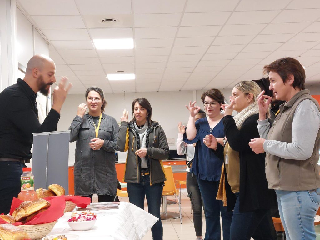 Nos collaborateurs ont eu l’occasion d’en apprendre plus sur la langue des signes autour d’un petit-déjeuner. L’objectif était de les sensibiliser à cet outil de communication via un moment de partage et de convivialité. Les participants ont donc eu l’occasion de commander leur collation en LSF grâce aux notions transmises par les différents intervenants.